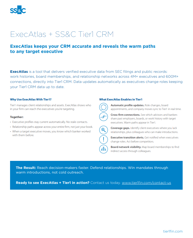 ExecAtlas is a tool that delivers verified executive data from SEC filings and public records: work histories, board memberships, and relationship networks across 4M+ executives and 600M+ connections, directly into Tier1 CRM. Data updates automatically as executives change roles keeping your Tier1 CRM data up to date.